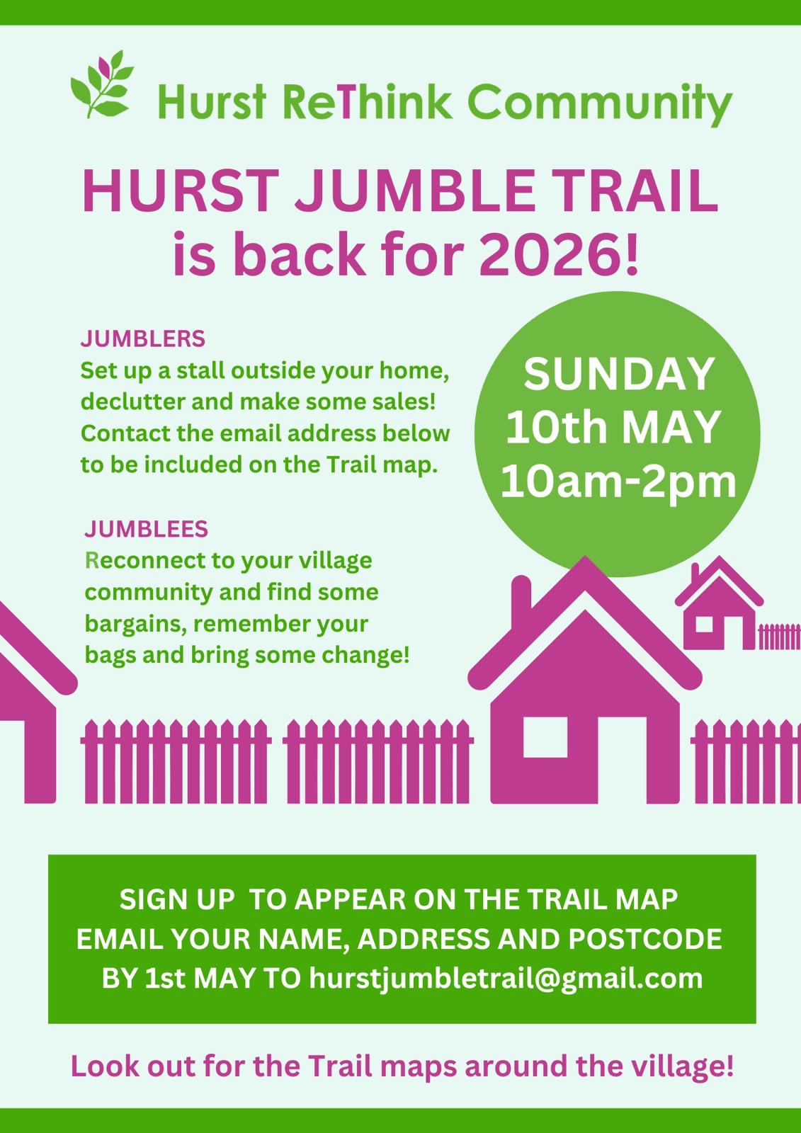 The Hurstpierpoint Jumble Trail is back for 2026 on Sunday 10th May 10am-2pm. Sign up to be a jumbler and set up your own stall outside your house. Sell or donate your jumble and reconnect with your neighbours and friends on what is a very sociable day. Why not get a group of neighbours together for several stalls? Email your address and postcode to hurstjumbletrail@gmail.com by 1st May to be included on the official Jumble Trail map. Watch this space for updates.